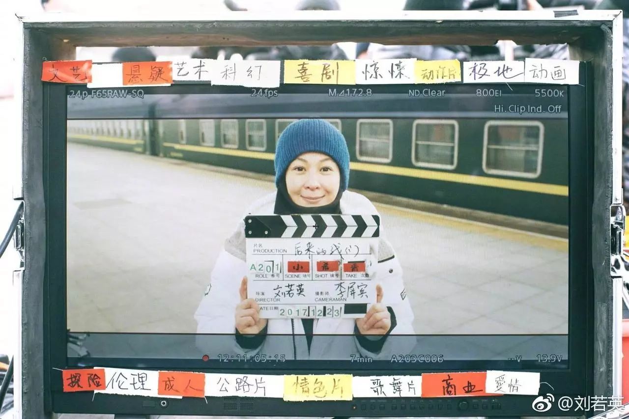 場記板上顯示該片的導演是劉若英,攝影師為李屏賓,還用紅色貼紙著名“小殺青”,日期顯示為2017年12月23日。而另一張好像是對著監(jiān)視器拍攝的照片,背景是一列綠皮火車,頗具年代感。