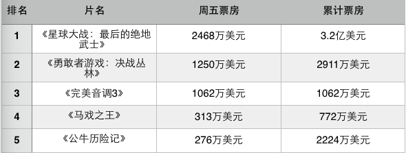 《星球大戰(zhàn):最后的絕地武士》周五在4323家影院上映,賣出2468萬美元票房,累計票房已經(jīng)突破3億美元關口,全球累計票房超過6億美元,預計將在這個圣誕檔周末收獲1.1億美元票房。
