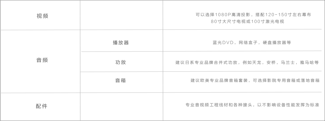 入門級私家影院適合一般家庭使用,對音效沒有極致要求,使用面積不太大或沒有獨立空間,性價比較高。入門級的影院定制方案,以性價比為出發(fā)點,又能夠滿足一般家庭的影音娛樂需求,影院的效果在感官體驗上與普通的商業(yè)電影院相媲美。